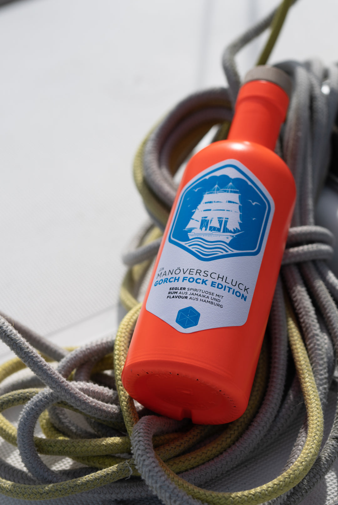 Our bottles are practical and handy, perfect for passing around on board. The striking colors are reminiscent of buoys and life jackets on the high seas, while the abstract logo depicts a sailing manoeuvre. The colors blue and white symbolize the sky, the clouds, the sails and the sea. The writing on the bottle is reminiscent of historical seafaring stencils that were used to label rum barrels and wooden boxes. The cork on our bottles pays homage to the many beautiful wooden boats that sail the seas.
